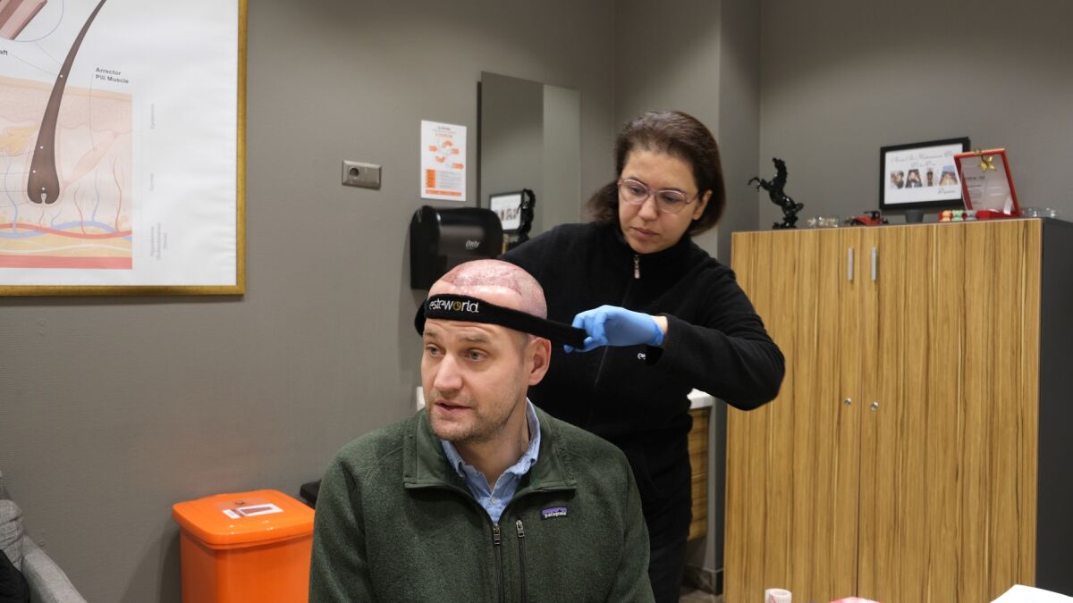 Na een korte nacht nam ik plaats in het busje van Esteworld. Met twee andere Nederlandse mannen werd ik naar de kliniek gebracht, waar een Vlaamse host op ons stond te wachten om de dag te beginnen. Heel fijn dat ik niet de enige was, dit gaf gelijk nog meer vertrouwen. Na de administratieve afhandeling en een bloedonderzoek kwam het kaal scheren. Dat was wel even gek, aangezien ik nog nooit kaal was geweest. Daarna de haarlijn uittekenen. Dit gebeurde met uiterste precisie en wordt gedaan door een arts met een enorme bak aan ervaring.